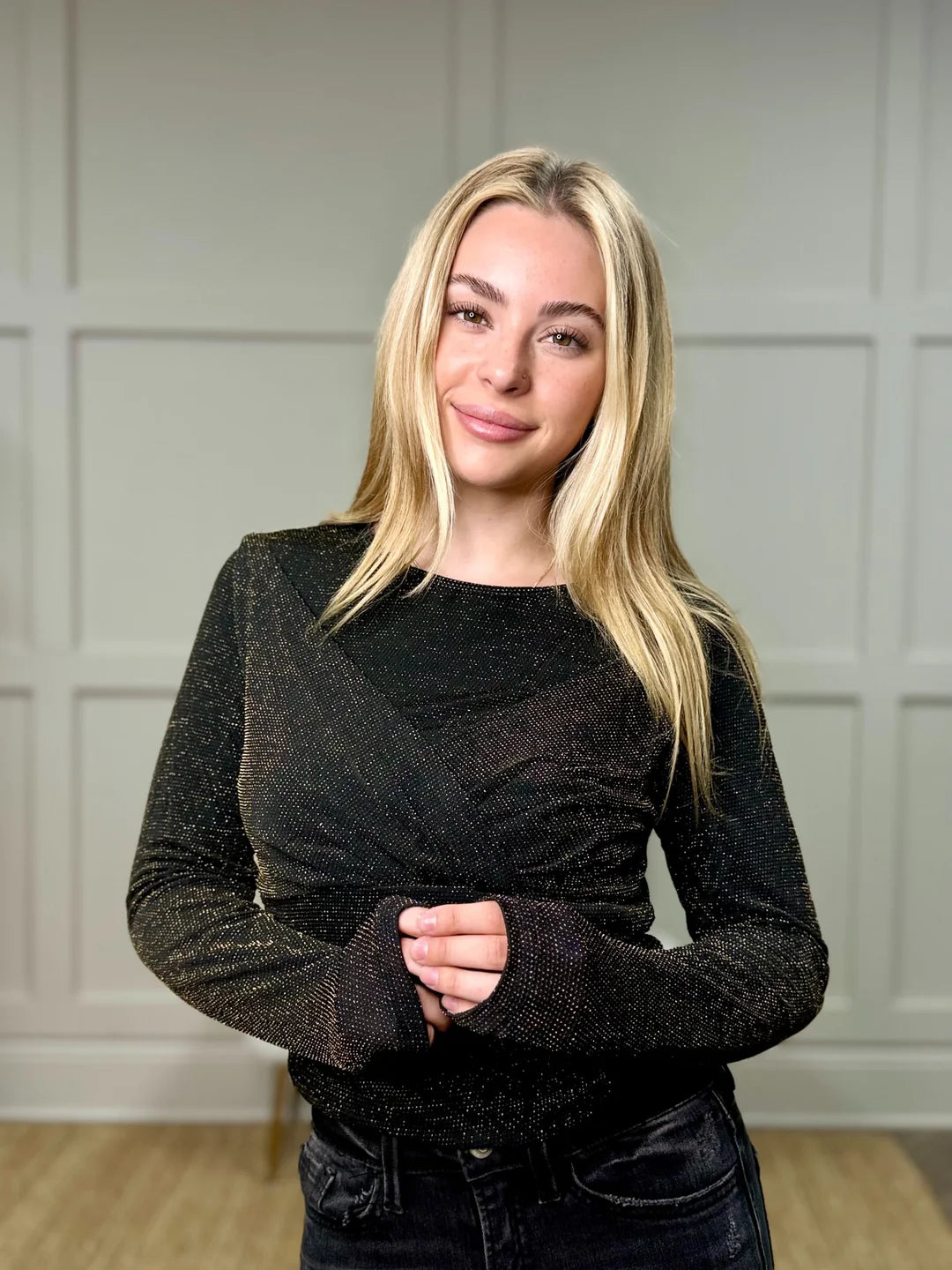 Ana is (5' 1" and Size 7/9 jeans) is wearing a size M