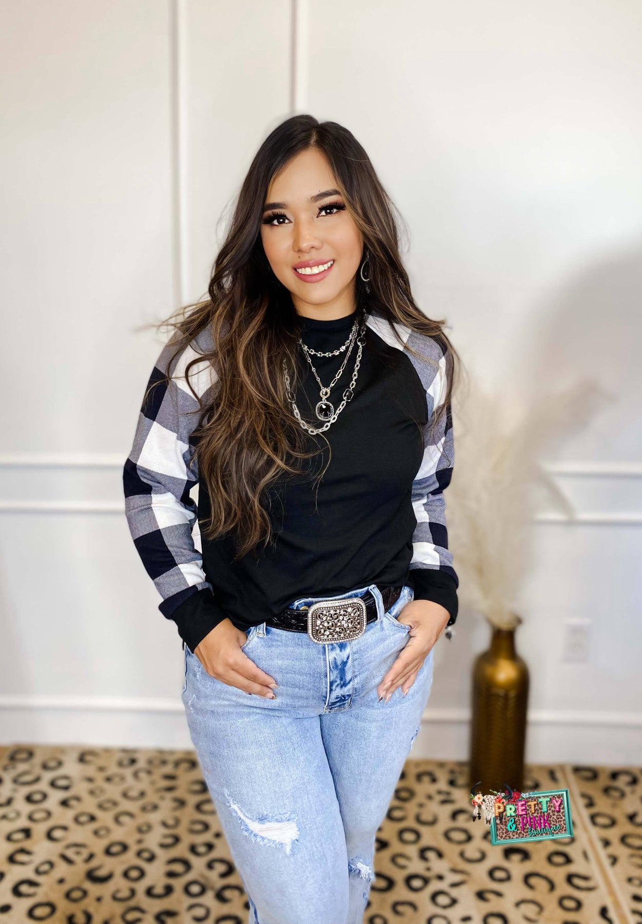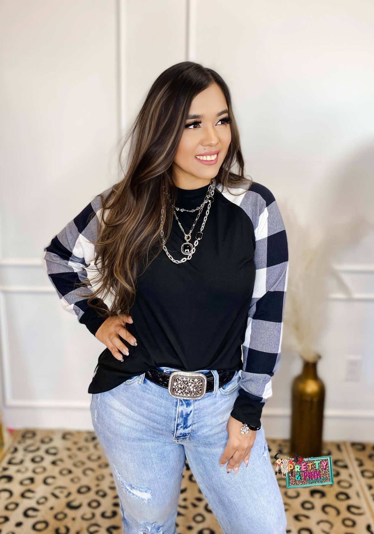 Cozy meets cute in this everyday favorite! This long sleeve top features a solid black body with soft plaid sleeves that add the perfect pop of style. True to size with great stretch for all-day comfort, whether you’re running errands or dressing it up with denim and accessories.
