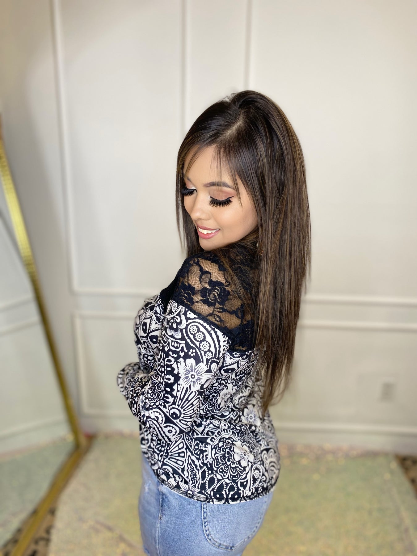 Chic meets feminine in this stunning black and white floral top. Designed with an intricate floral print and a sheer lace yoke for the perfect touch of elegance. The soft, stretchy fabric offers a flattering fit while keeping you comfortable all day long. Dress it up with statement jewelry or keep it casual with denim—this top does it all.