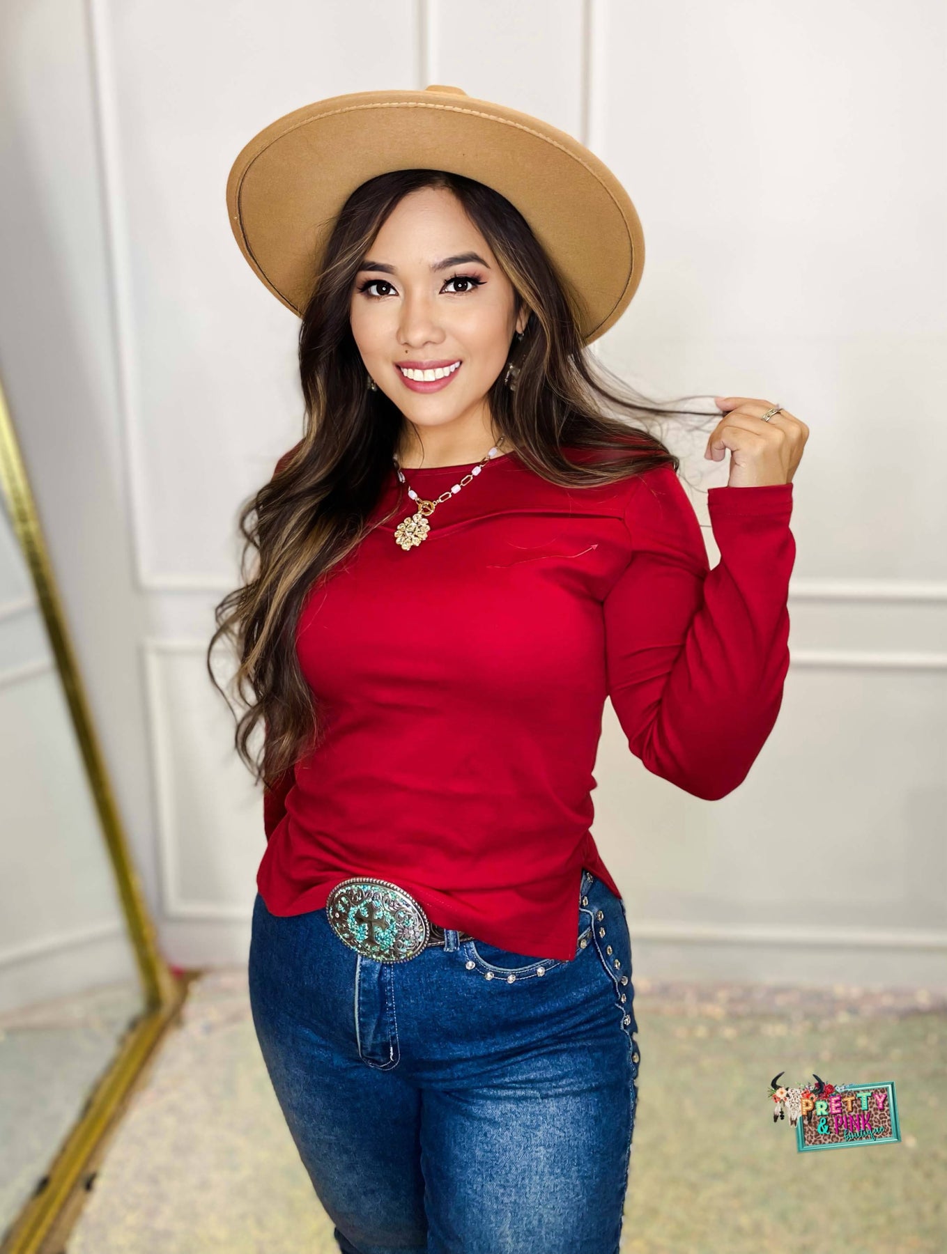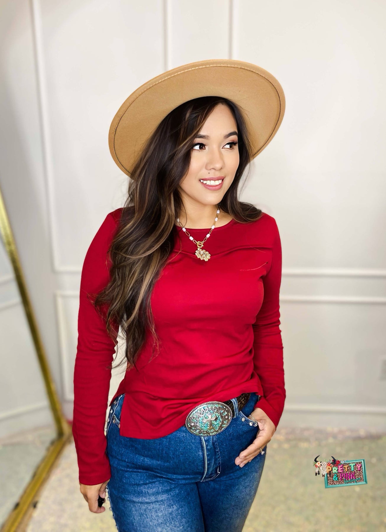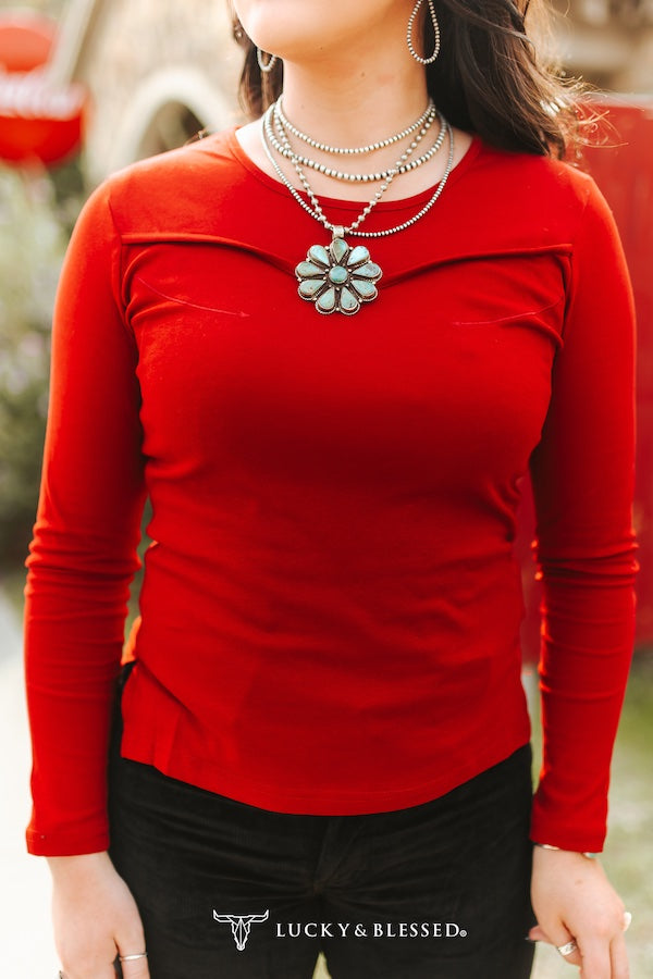 Elevate your closet with this rich camel long sleeve top—crafted for the bold cowgirl who blends comfort with effortless style. Featuring a unique sculpted yoke design that mimics the curves of a traditional Western yoke, this piece adds subtle texture and interest while staying sleek and modern. The stretch-knit fabric hugs the body for a flattering fit, while the lightweight construction makes it ideal for layering under denim jackets, fringe vests, or overalls. Styled with a statement concho belt and high-rise denim, this top embodies rustic charm with contemporary appeal, perfect for transitioning from ranch days to rodeo.