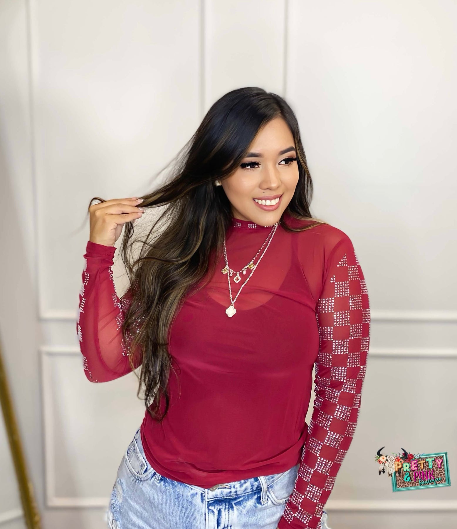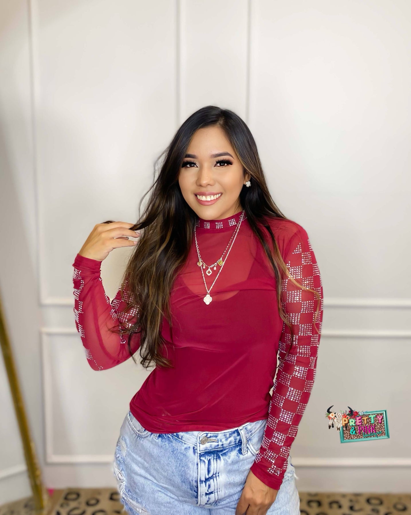 Make a bold statement with the Checked In Maroon Mesh Top, featuring a rich maroon mesh fabric embellished with sparkling rhinestones arranged in a stylish checked pattern on the sleeves and neckline. This top combines elegance and edge, perfect for adding a touch of glamour to your wardrobe while keeping you comfortable and confident.