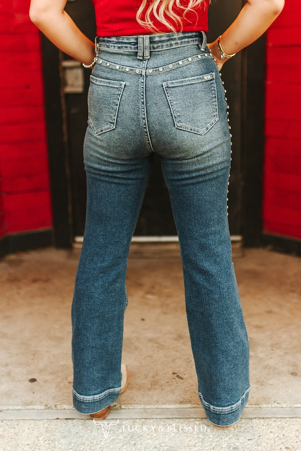 Turn heads with our Mid Wash Studded Flare Western Jeans – a must-have for the bold Western woman. Crafted in a flattering flare silhouette, these denim jeans feature silver stud detailing along the front pockets and outer seams, adding just the right amount of edgy glam. The vintage-inspired mid-wash finish and high-rise fit hug in all the right places, offering both style and comfort. Finished with classic back pockets and a zip-button closure, these jeans are the perfect match for cowboy boots, graphic tees, or fringe jackets.