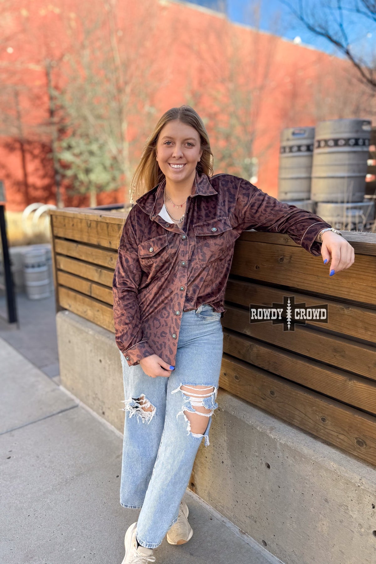 Classic western with a wild twist- the Leopard Lady Button Up is a statement staple. Featuring an allover leopard print on a rich, earthy base, this button up is finished with concho buttons accented with turquoise for that perfect pop of western charm. Designed with chest pockets, contrast stitching, and a relaxed, easy fit, itβs made to wear buttoned up, layered, or thrown on over your favorite tee.