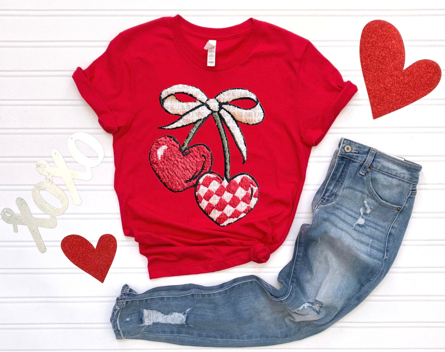 Valentine-inspired cherry heart graphic with bow detail