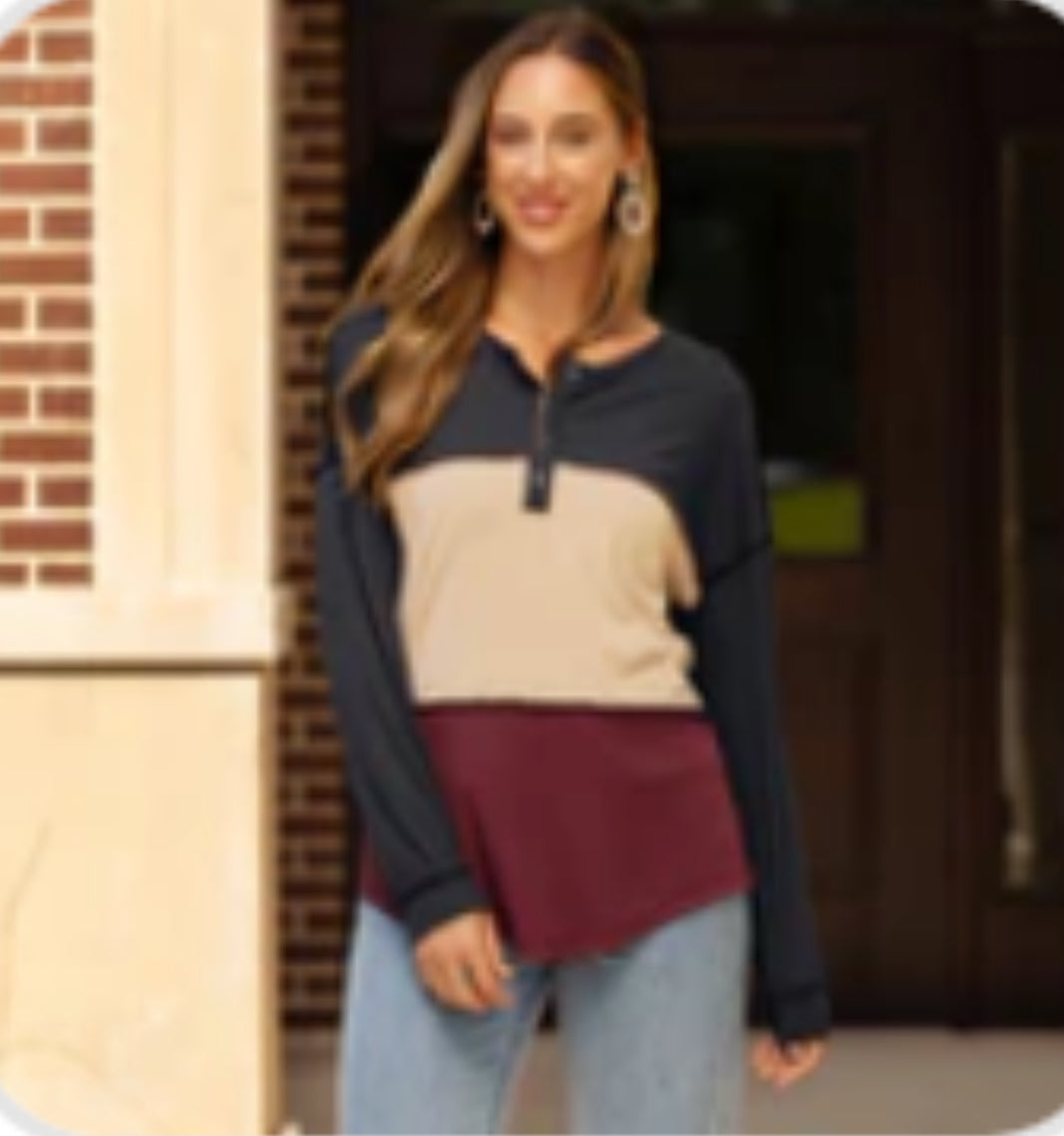 Effortless style meets everyday comfort in this chic colorblock long sleeve. Designed true to size with stretch, it features a soft ribbed fabric and a flattering relaxed fit. The navy, cream, and wine panels give it a trendy layered look, while the henley neckline adds the perfect touch of casual charm. Easy to dress up or down—pair it with denim, boots, or sneakers for a cute and comfy outfit all day long.