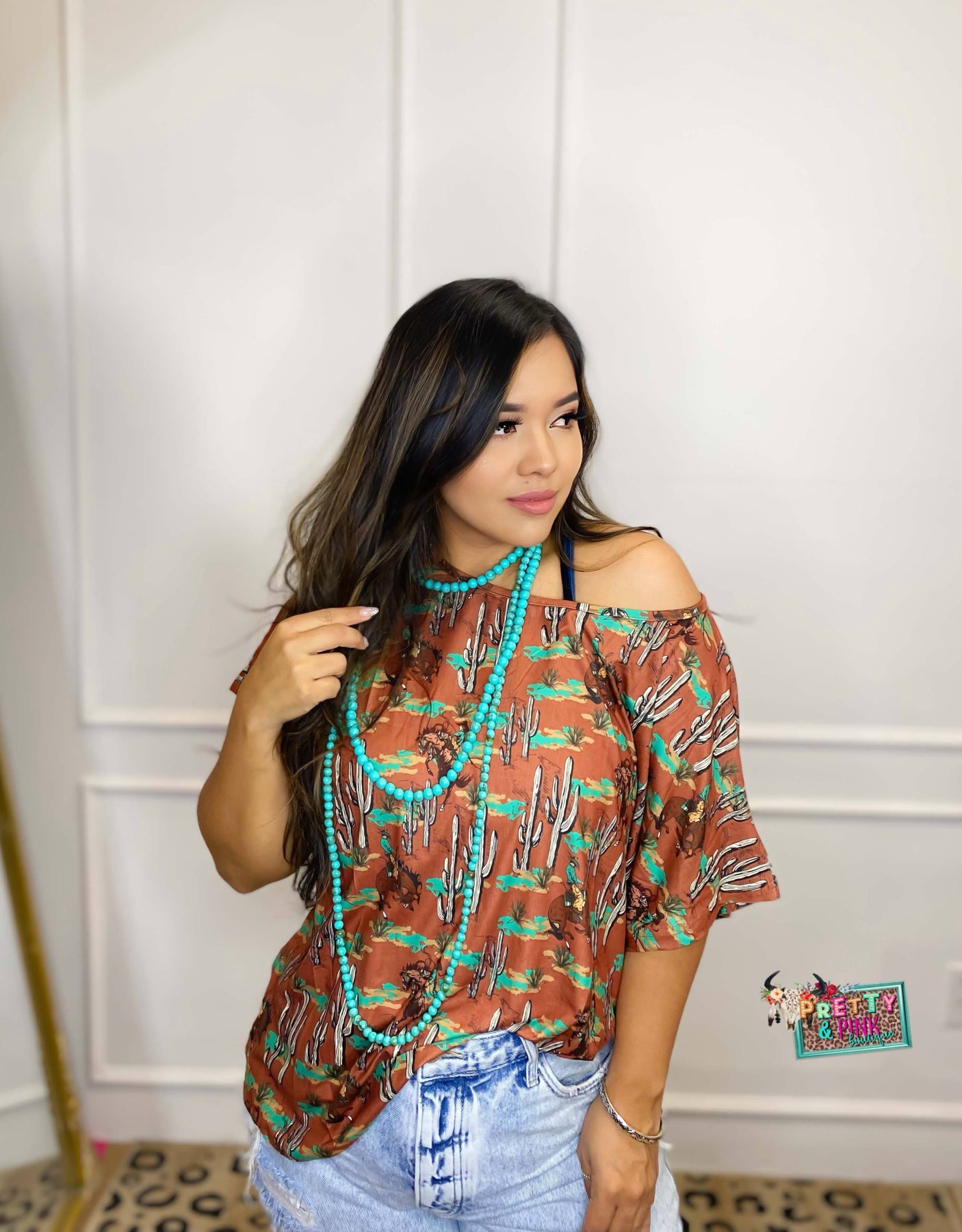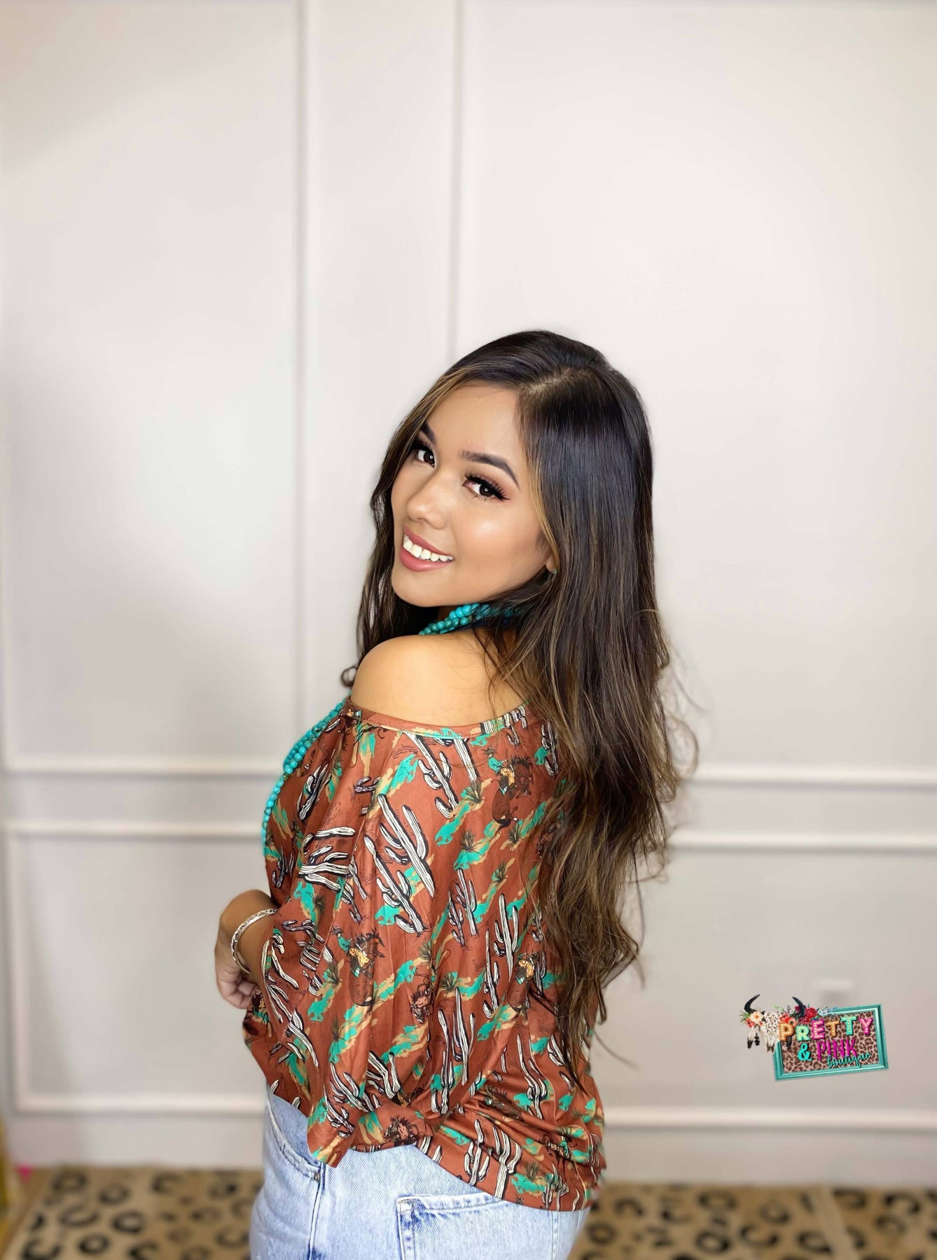 Embrace the spirit of the wild west with the High Desert Hustle Top. This flowy shirt features charming bucking horses, cacti, and lush greens, bringing a playful touch of desert adventure to your wardrobe. Perfect for those who love a relaxed fit with a dash of western flair.