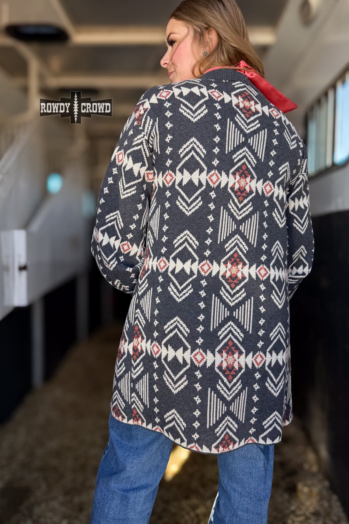 The Crossfire Cardigan brings bold western energy wrapped in everyday comfort. This long, charcoal knit features an allover geometric pattern in cream and soft red, giving it that classic, cozy–but–cowgirl feel. Balloon sleeves and an open-front silhouette make it an easy throw-on layer, whether you’re headed to the barn, the boutique, or just needing something snug for chilly mornings.