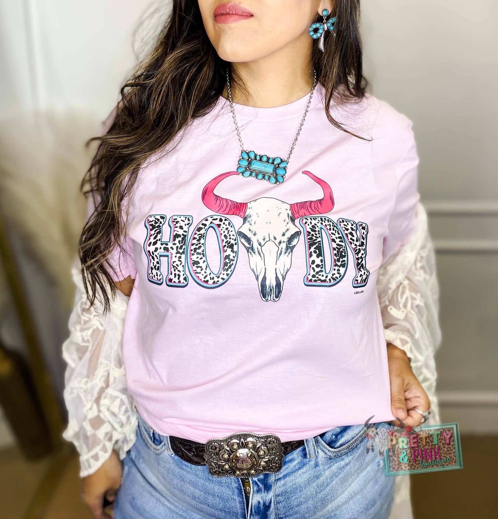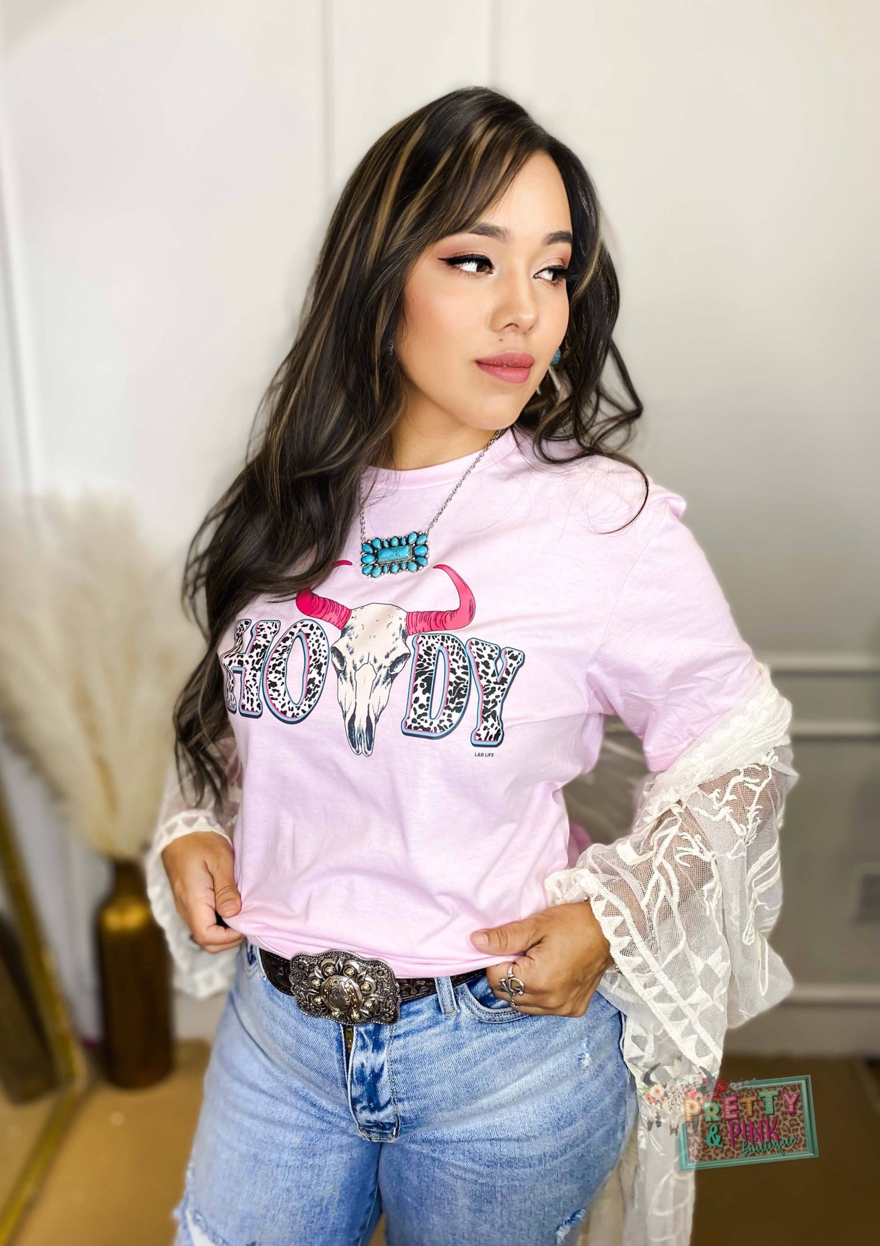 Bring a little western sass to your everyday lineup 🤠💗 This soft pink graphic tee features a bold “HOWDY” design with a statement longhorn skull and pops of leopard detail for that perfect mix of cowgirl and cute.