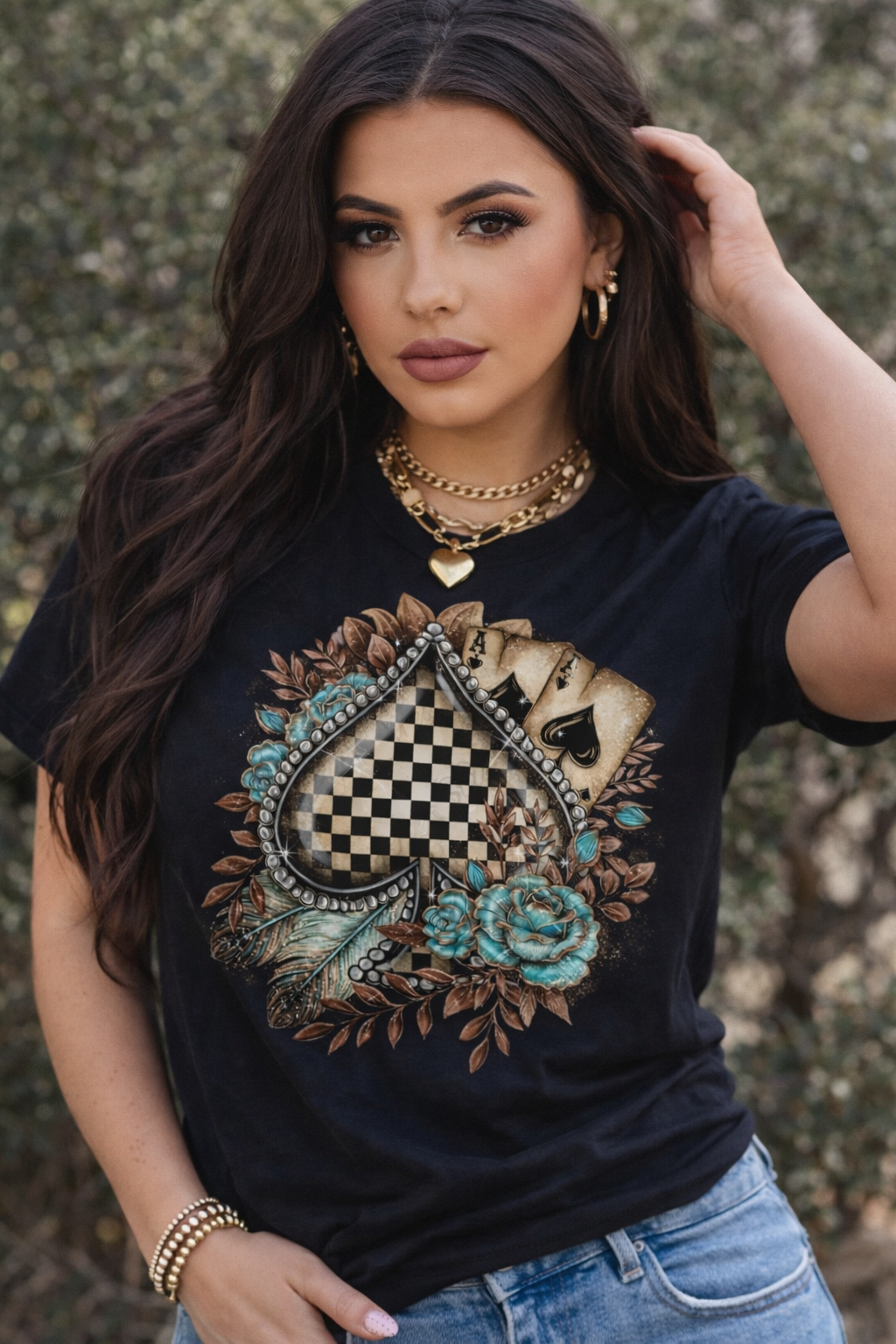 This statement piece features a bold vintage-inspired spade design layered with distressed playing cards, turquoise florals, and soft feather details, giving you that perfect mix of western charm and edgy glam.
