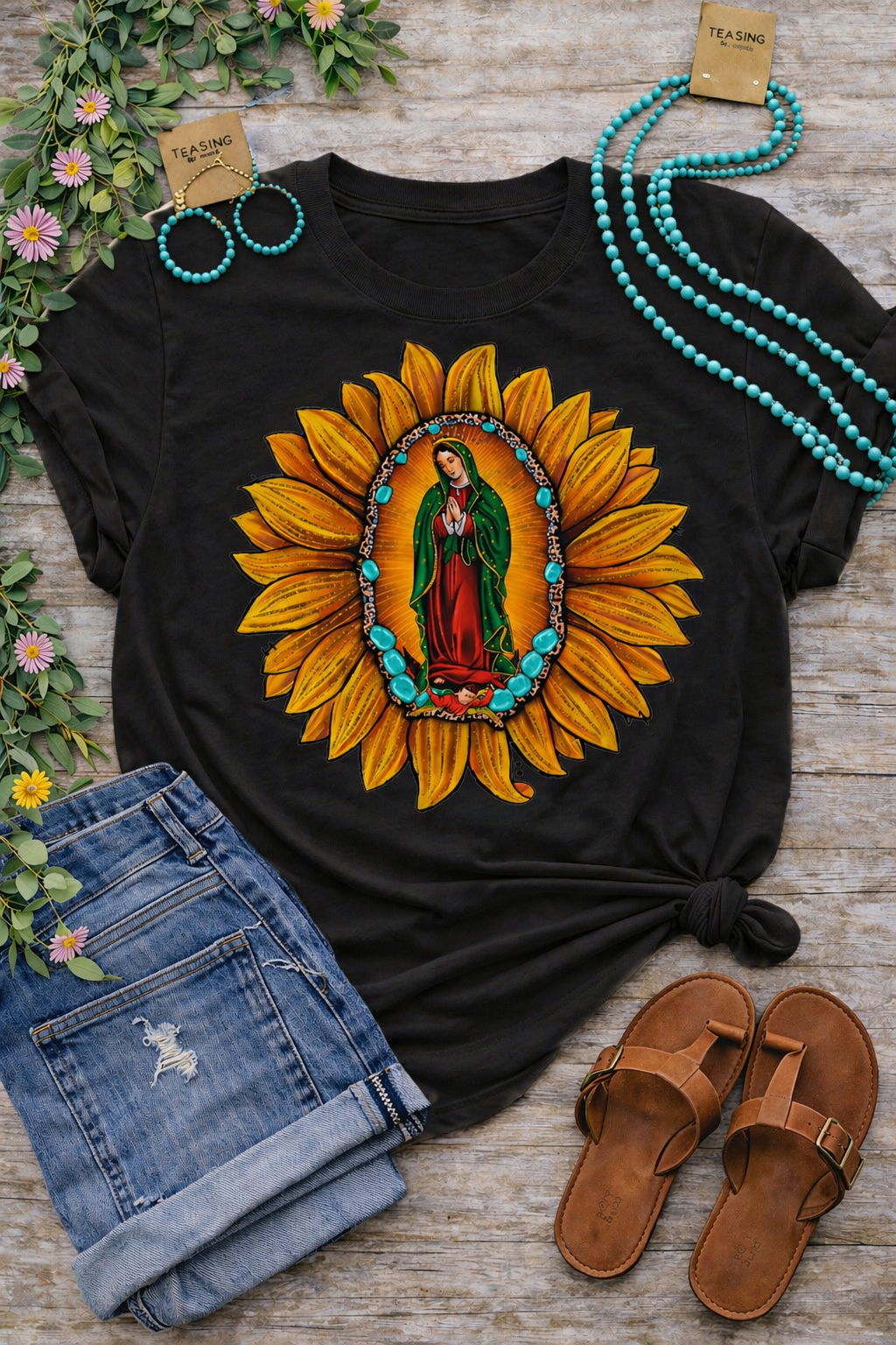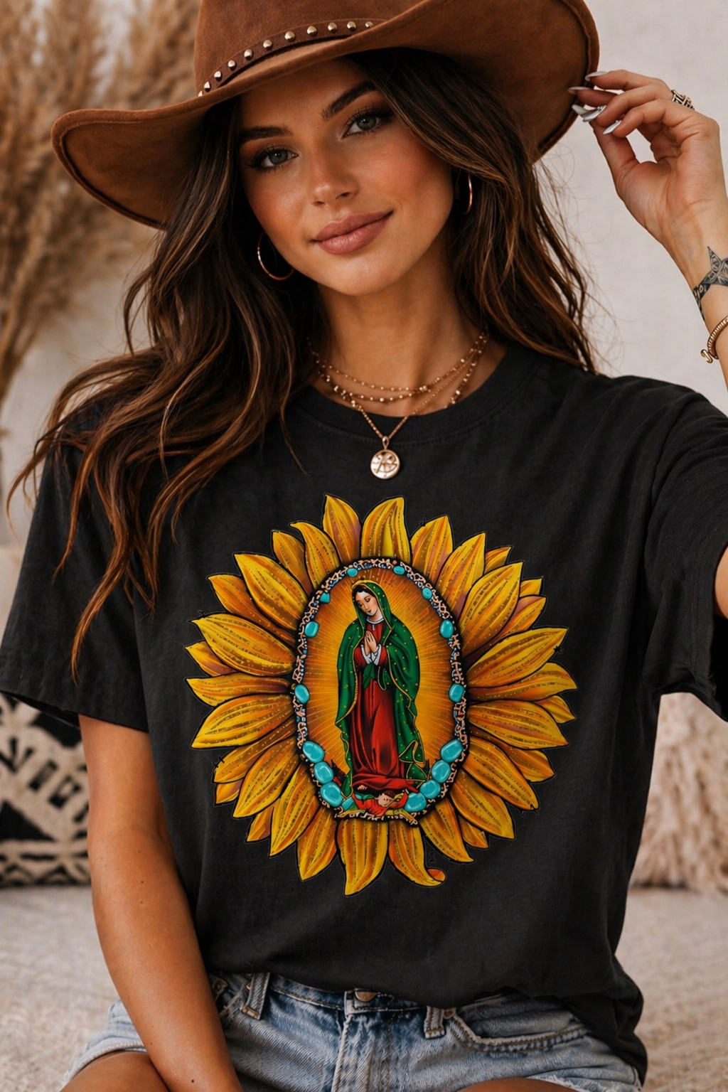 Our Virgin Tee features a stunning Our Lady of Guadalupe design framed by vibrant sunflower details and turquoise accents, creating the perfect blend of faith, beauty, and western charm.