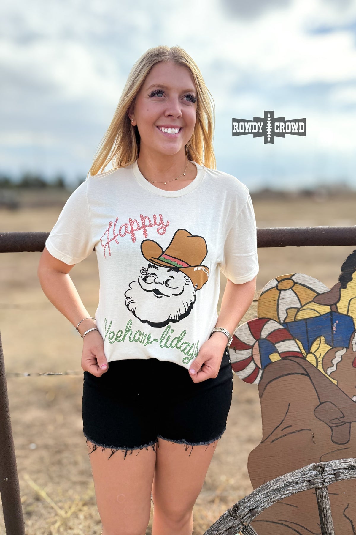 Santa’s gone western! The Yeehaw-lidays Tee brings festive cheer with a cowboy twist-featuring a jolly Santa in a hat and rope-style lettering. Soft, fun, and full of western holiday spirit, this tee is perfect for every cowgirl or cowboy celebrating Christmas, Rowdy Crowd style.