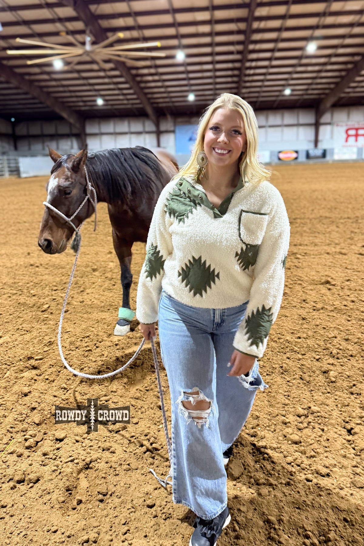 Stay warm, stay rowdy, and look downright darlin’ in our Huckleberry Pullover. This cozy cream sherpa is decked out with olive-green Aztec patches, giving it that punchy western edge without sacrificing comfort. The contrast snap-button neckline and matching pocket trim add just the right amount of detail, while the soft, snuggle-worthy feel makes it an instant cold-weather favorite.